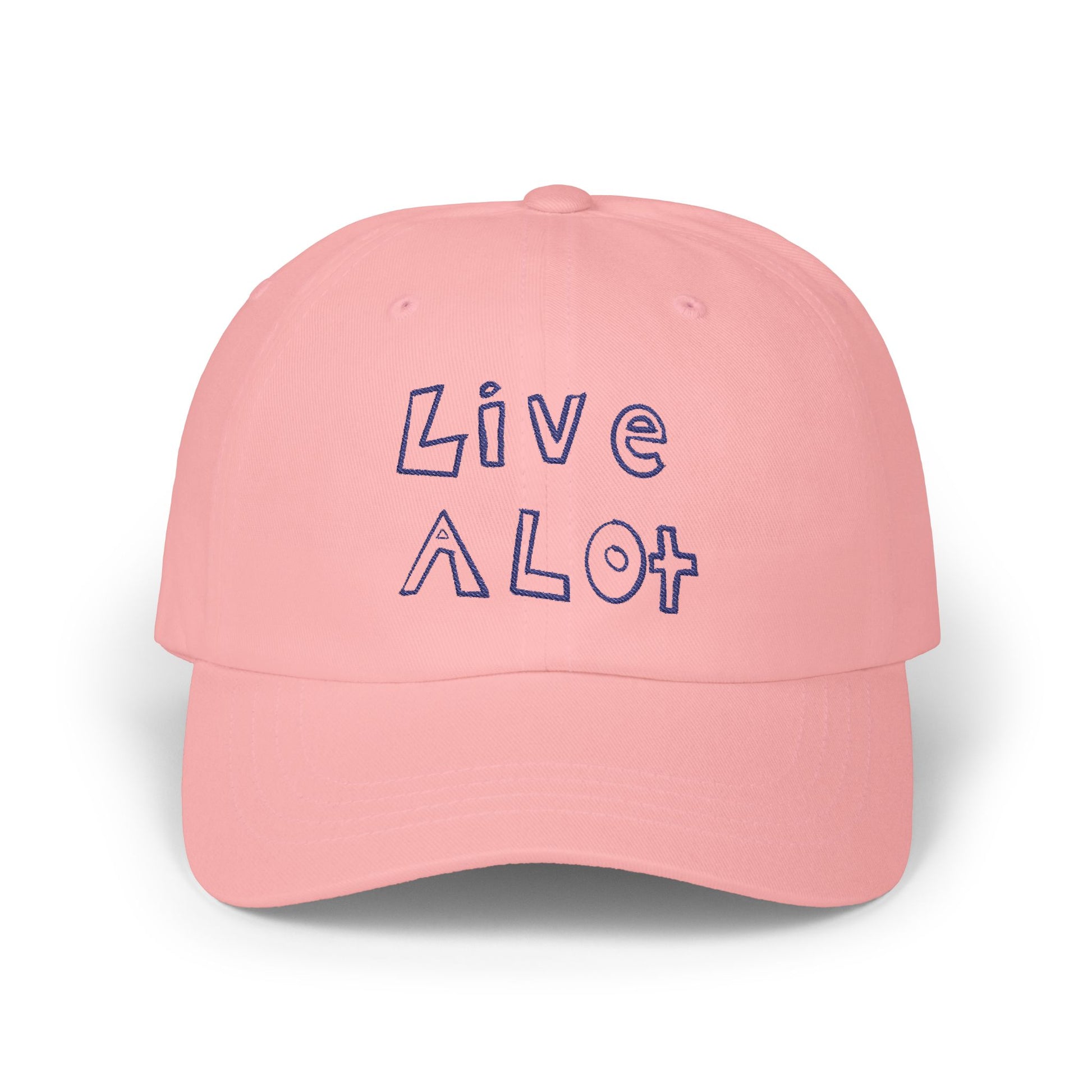 LIVE A LOT - Dad Cap – Pink Hat with Navy Blue Embroidery!